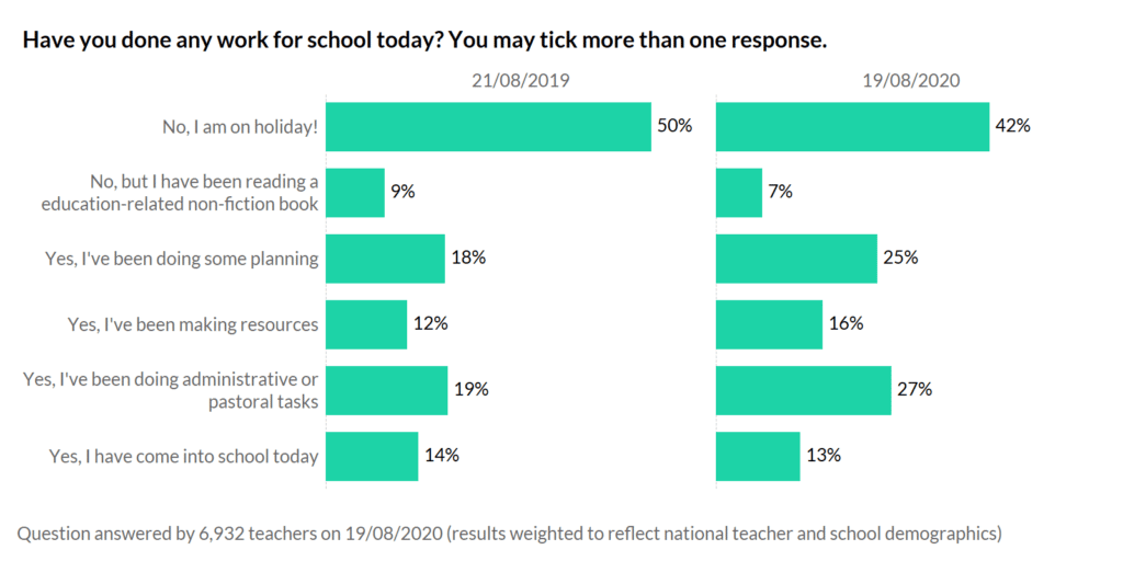 The vast majority of secondary classroom teachers have stayed away from school over the summer, and even primary classroom teachers haven’t been into their classroom much. By contrast, headteachers have been into school a lot. Half of secondary heads have been in at least once a week. How are we ever going to give them a proper break?