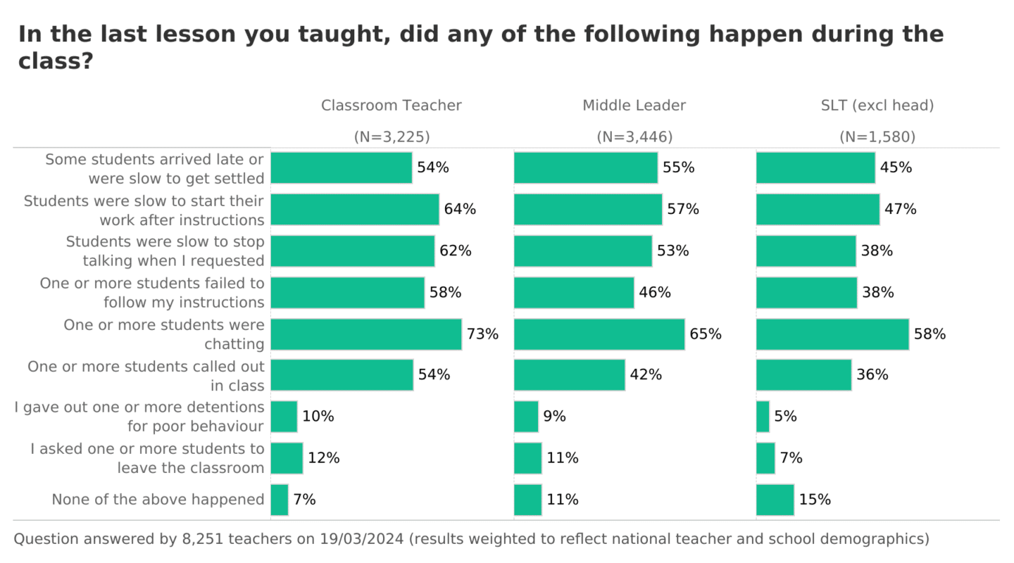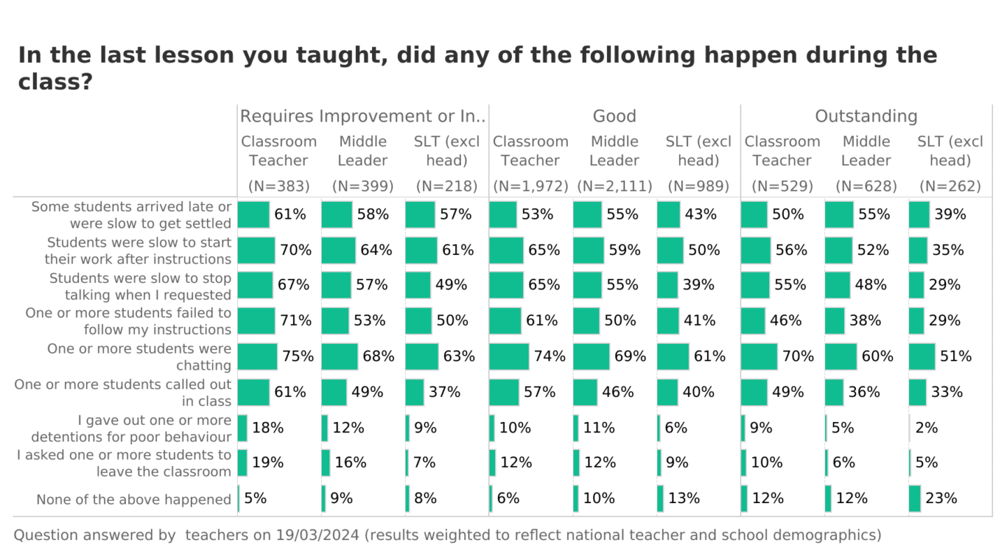 As the above shows, the experience in the classroom for a senior leader in a school that is graded ‘requires improvement’ reports similar levels of low-level disruption as a classroom teacher in a school graded outstanding.