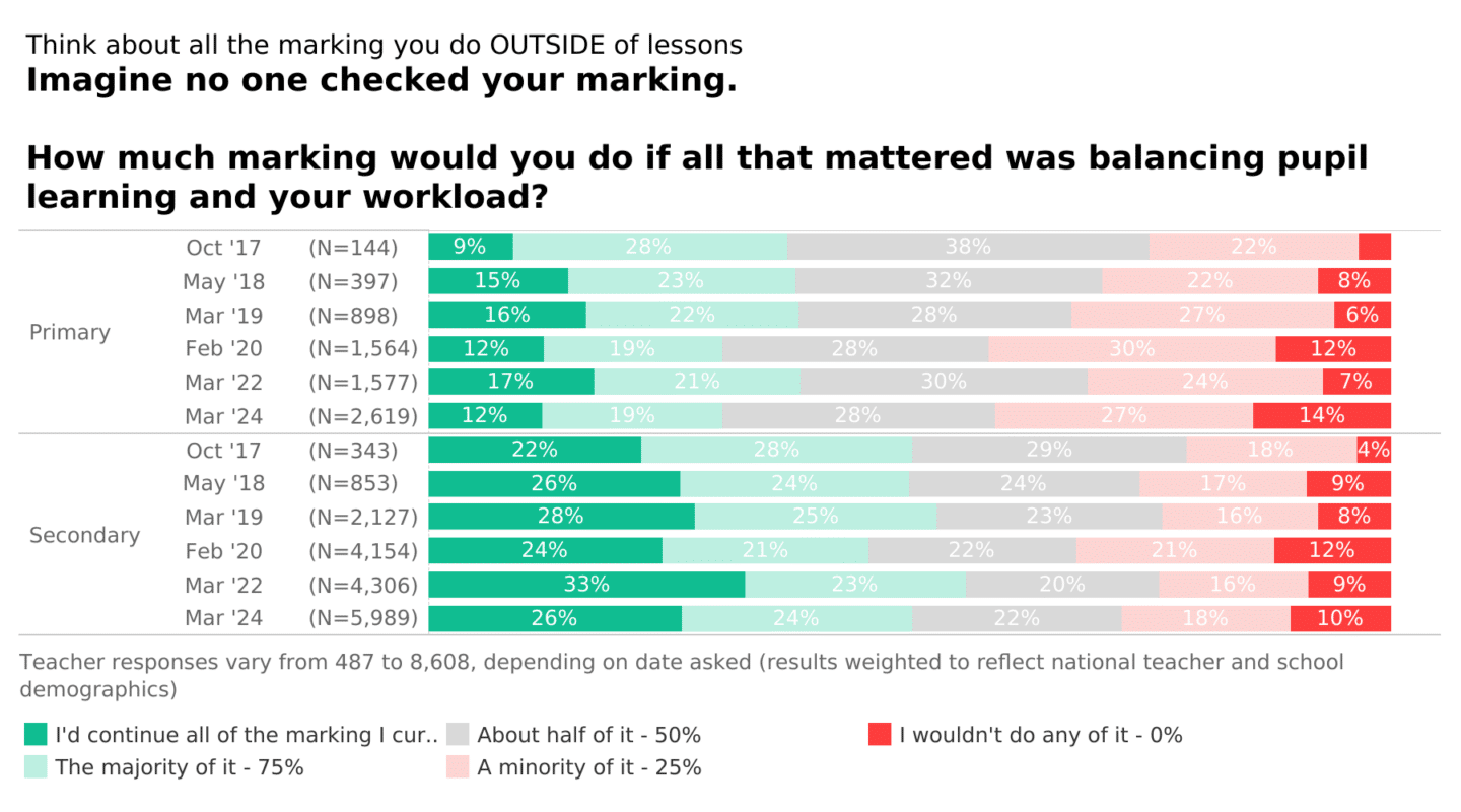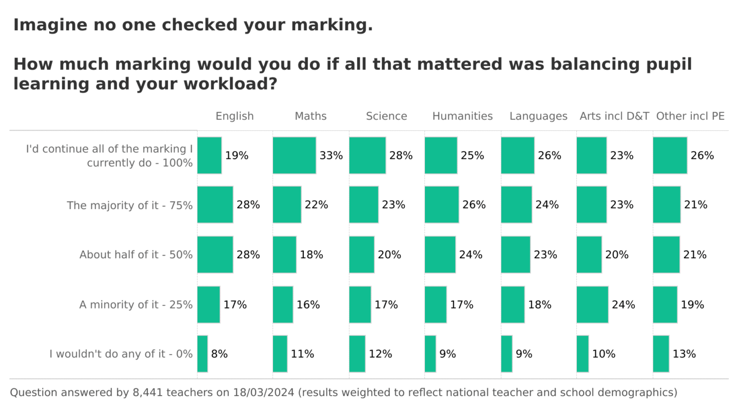 But what about different subjects? Well – here it’s clear – English teachers are the least likely (19%) to carry on marking at the same rate if nobody checked up on them, and maths are the most likely (34%).