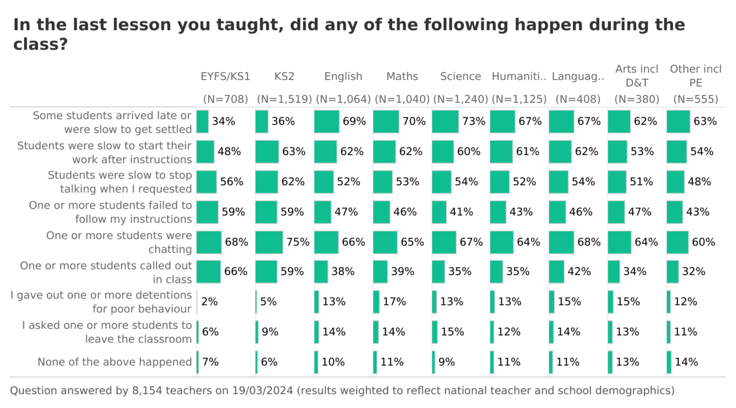 The most significant difference was that far fewer of you in primary classrooms told us you had issues with students arriving late (34% in KS1 and 36% in KS2 and this makes sense – far fewer chances to be late in primary!) and the number of you telling us you had calling out was lower in secondary.