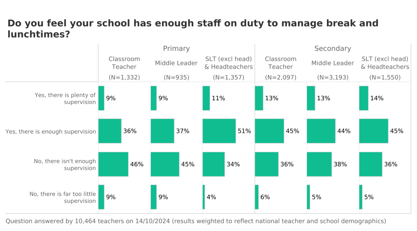 Sometimes in schools, the perception of classroom teachers and senior leaders can vary – however, in the case of breaktime supervision, this is only the case in primary schools: 45% of classroom teachers say there is enough, compared to 61% of senior leaders including headteachers.