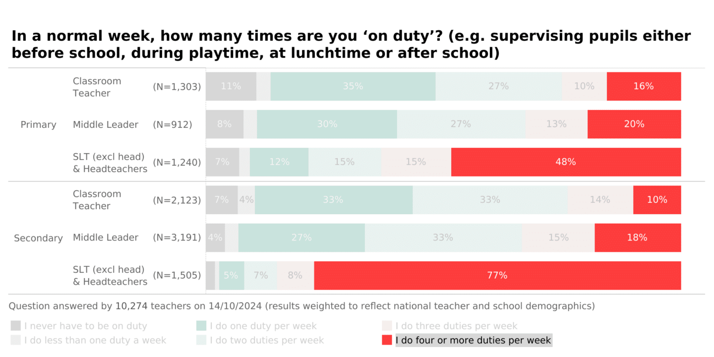 Secondary headteachers and senior leaders are more likely than primary senior leaders to be doing four or more duties a week (77% vs 48%). More time treading the concrete of the playground could give secondary leaders and classroom teachers a more aligned view of the needs of their pupils during lunch and break.