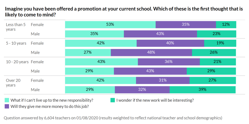 At all ages, women are much more likely to worry about their ability to undertake the promotion than men, whereas men’s first thought is about their paycheck (until they’ve been in the profession for 20 years at which point they switch to worrying about whether or not the job will be interesting – possibly because they’ve already pocketed so much cash!)