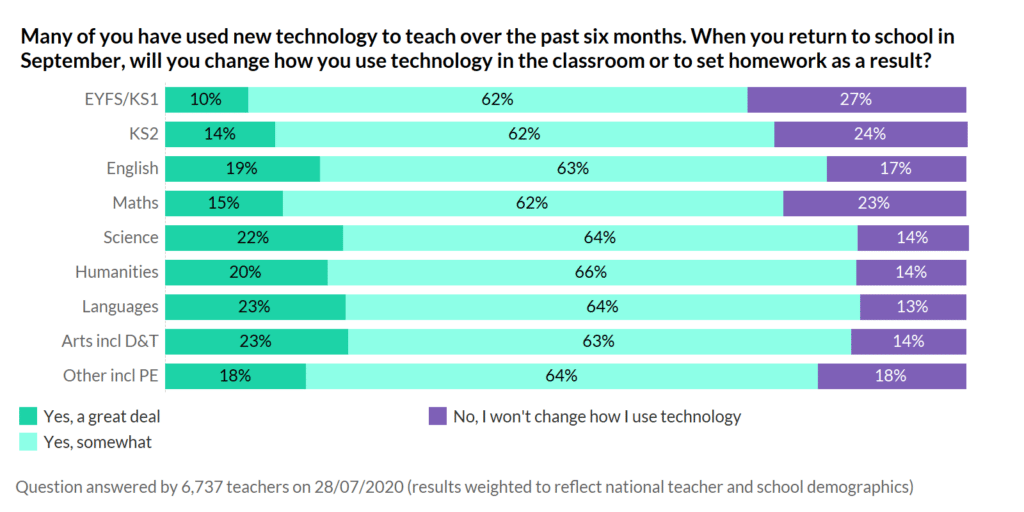 Those of you teaching science, language and Art/DT were the most enthusiastic about tech – with 1 in 4 intending to use it a ‘great deal’ when schools return.