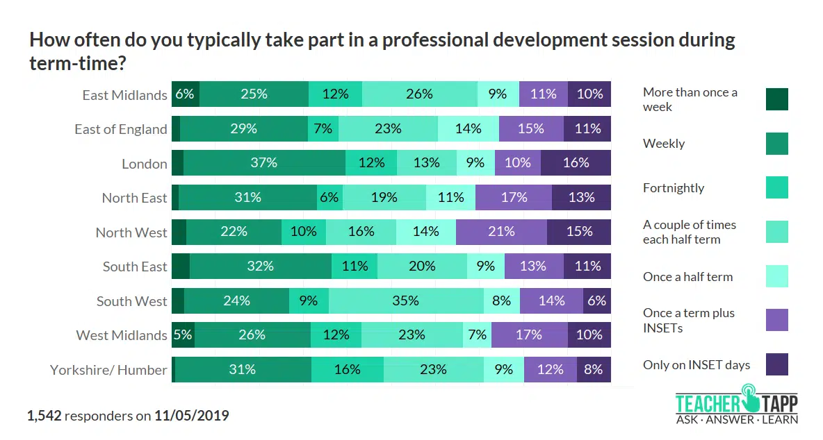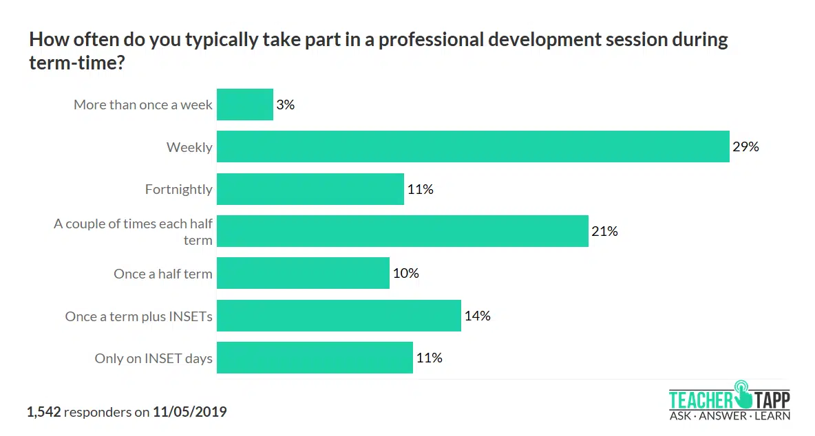 One in three teachers has weekly professional development during term time. For example, through a weekly training session. That’s a lot!