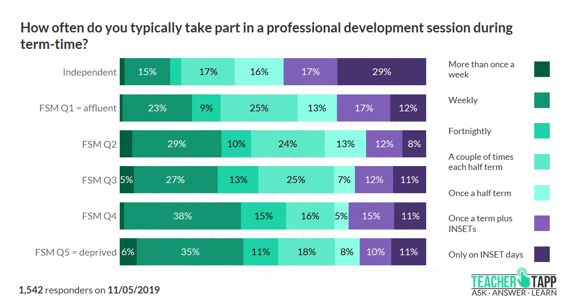 It’s clear that private schools are lagging the pack here. Around half (47%) said you get professional development sessions less than once a half term. On the other hand, those of you working in schools serving the most disadvantaged communities get the richest CPD experience. What could explain these patterns?