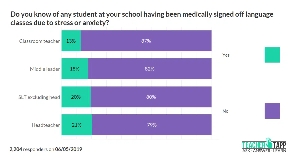 At the NAHT conference, we heard stories of children finding foreign languages so stressful that they are being medically signed off from the classes. Becky didn’t think this sounded like a common occurrence, but we found that 16% of you reported having had this happen at your school.