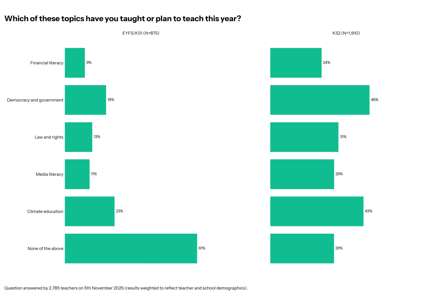 Almost half of KS2 teachers are already teaching democracy and government (46%), and a similar number climate education (43%). In fact, just 29% of KS2 teachers report they weren’t teaching ANY of the topics on the list.