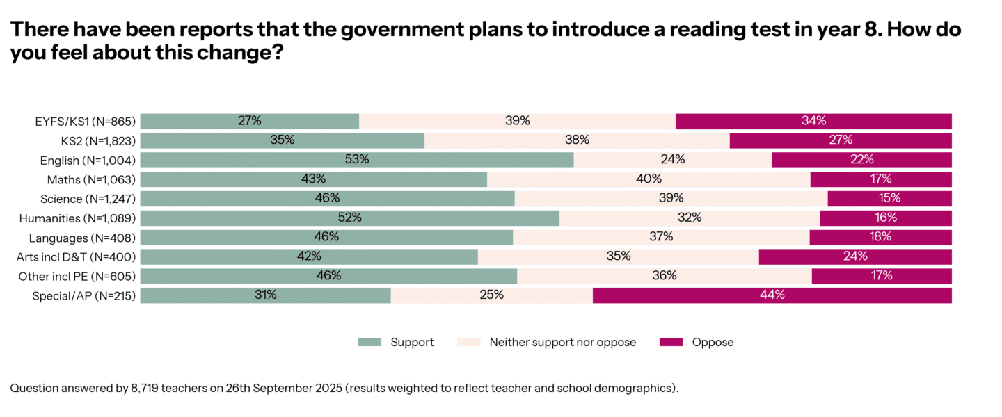 Among EYFS/KS1 and KS2 teachers, support was more muted, with only 27% of EYFS/KS1 supporting the test, and 35% of KS2 feeling the same.