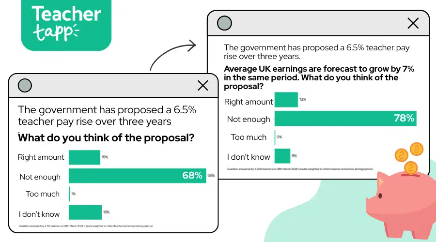 To get a better understanding of how teachers were reacting to the proposal, we split Teacher Tappers in two, and half were asked what they thought of a 6.5% increase over three years, and the other half were given some extra context, and asked what they thought of a 6.5% increase over three years given salaries were due to increase by 7% over the same time frame.