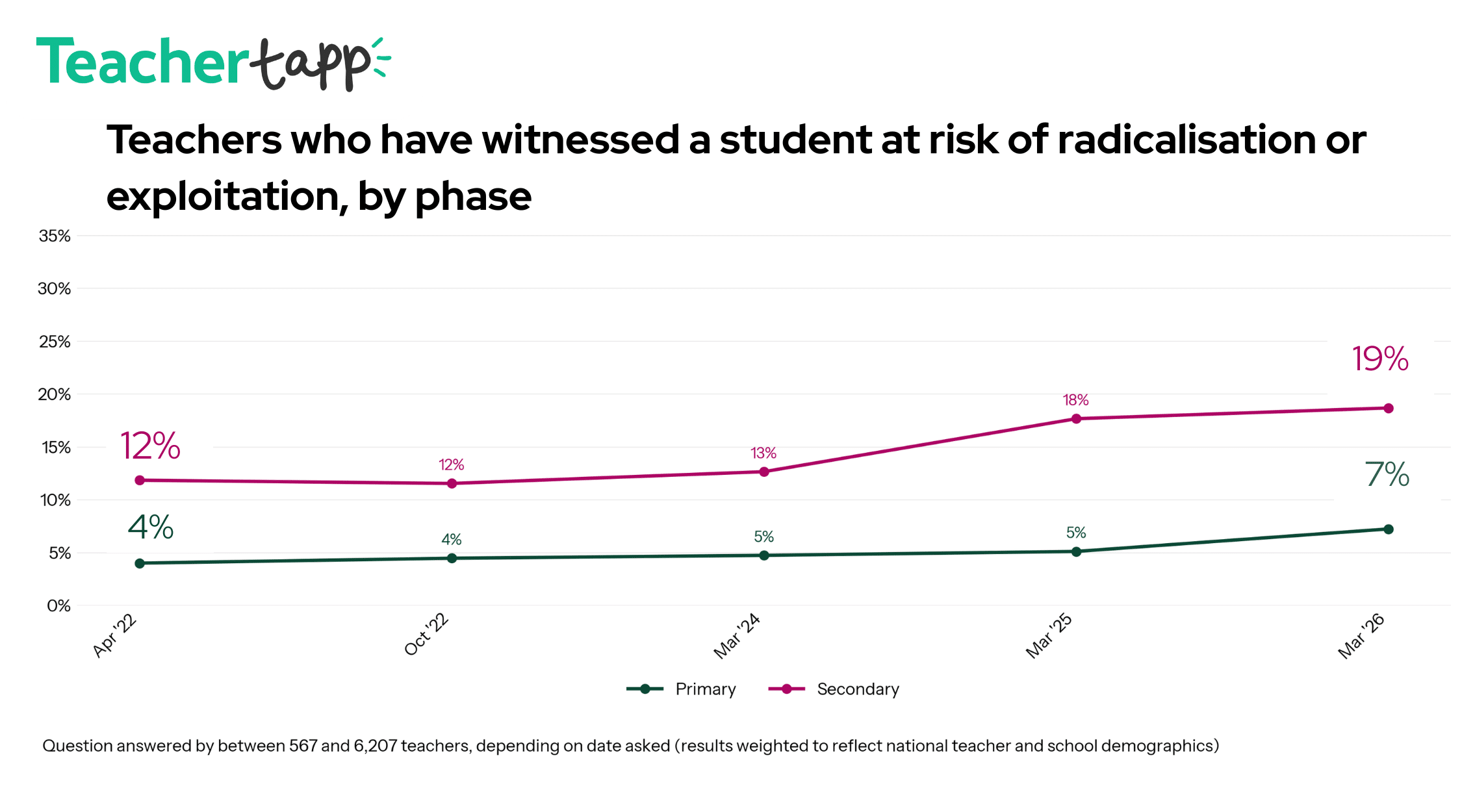 Teachers who have witnessed a student at risk of radicalisation or exploitation have risen since 2022, in secondary, moving from 12% to 19% and in primary, 4% and 7%.