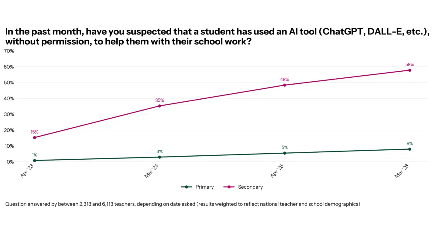 Since 2023, there has been a steady rise in primary and secondary teachers reporting a student has used an AI tool without permission. For secondary teachers, it began at 15% in 2023, grew to 35% in 2024, 48% in 2025 and then 58% in 2026. Primary teachers, the problem is more niche, but has risen from 1% to 3% to 5% to 8%.