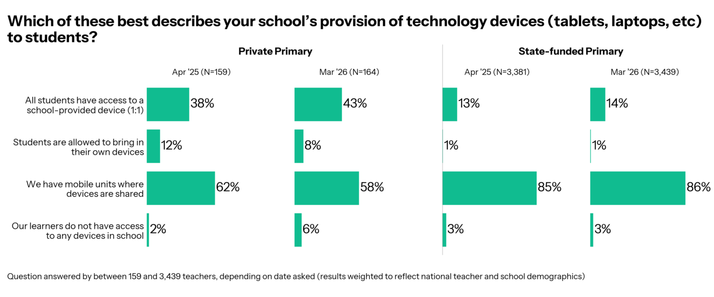 Primary teachers report similar gaps, and similar changes: 38% of teachers in private primary schools reported 1:1 devices, this is now UP to 43%. In state schools, again, that figure is smaller, and it is not shifting: 13% in 2025 and 14% in 2026.