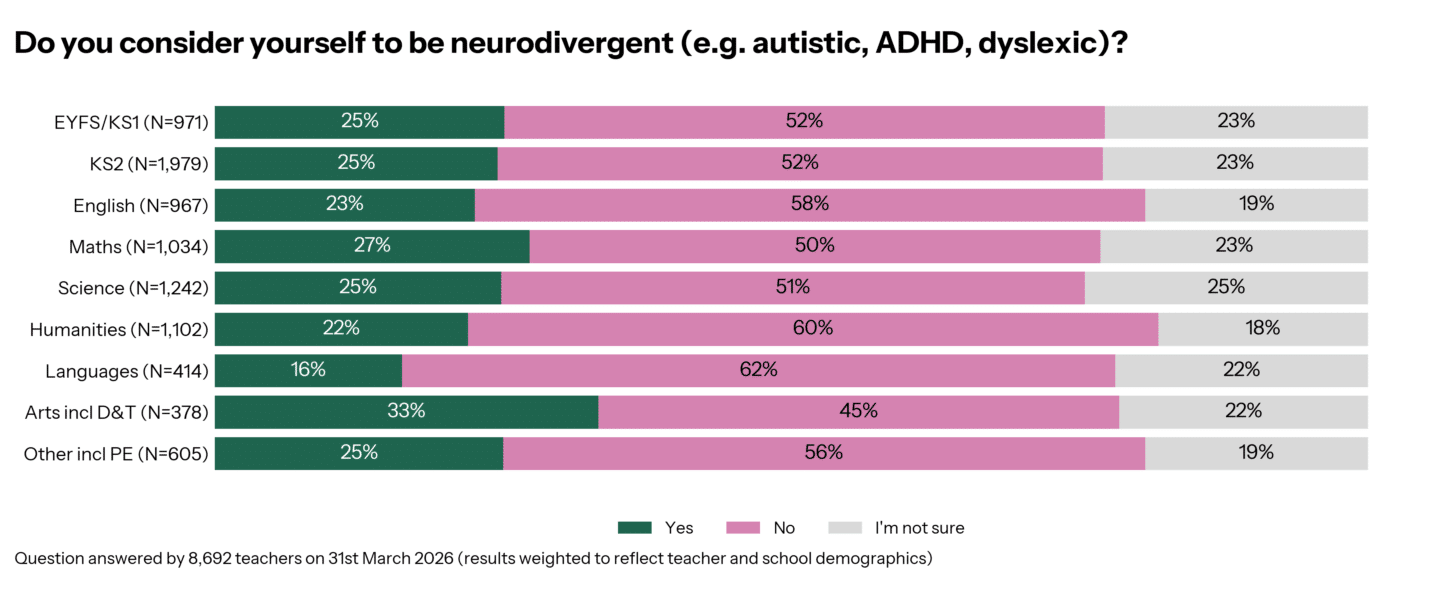 Languages teachers were the least likely to identify themselves as neurodiverse (62% said outright ‘no’), and arts inc D&T were the most likely to say they were (33% yes and 22% not sure).
