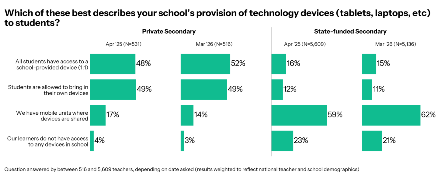 In private secondary schools, 52% of teachers say they have 1:1 devices, and this is UP on last year when it was 48%. In state schools, just 15% say the same, and this is virtually unchanged from the previous year, when it was 16%. Access to technology is far more restricted in state schools, and that gap is growing.