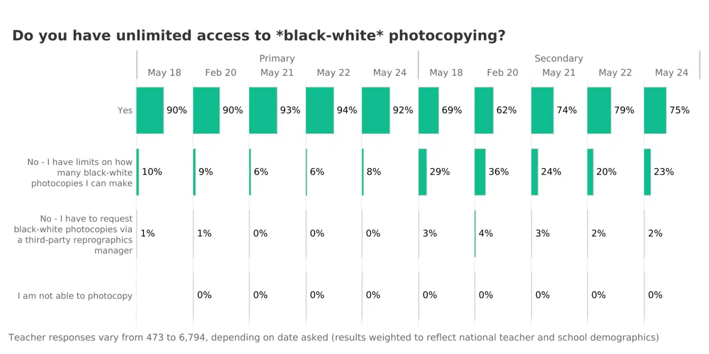 Looking at trends over time, primary is pretty much in the same state as it was in 2018, whereas in secondary slightly more people have unlimited photocopying access (though has dipped a little (four percentage points) since we last asked in 2022).