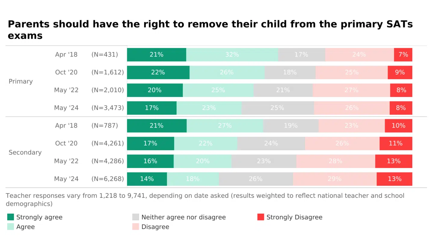 But should parents have the right to removed their son or daughter from the KS2 SATs tests? π« 17% of primary teachers said they ‘strongly agreed’ that parents should be able to opt out, compared to 14% of secondary teachers .
