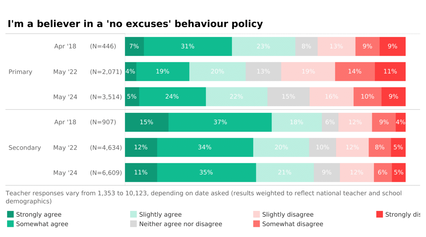 Splitting the data into primary and secondary, there is a less enthusiasm for ‘no excuses’ with teachers of younger pupils (51% agree vs 67%).
