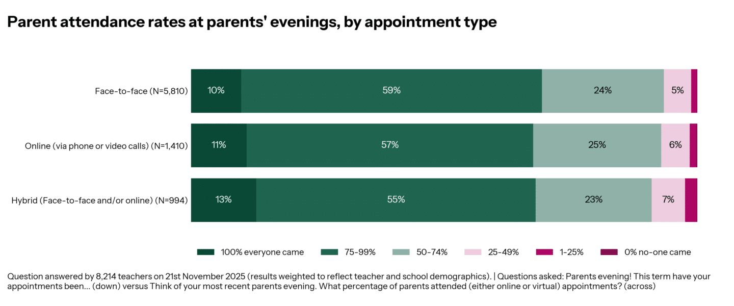 100% attendance at parents evening was reported by 10% of teachers in schools that had face-to-face appointments, 11% of teachers in schools with online or telephone appointments, and 13% of teachers that adopted a hybrid approach with both in-person and online appointments. It’s only three percentage points, but if you’re trying to increase 100% attendance and you don’t already have a hybrid option, this could be a change that might move the dial in the right direction.