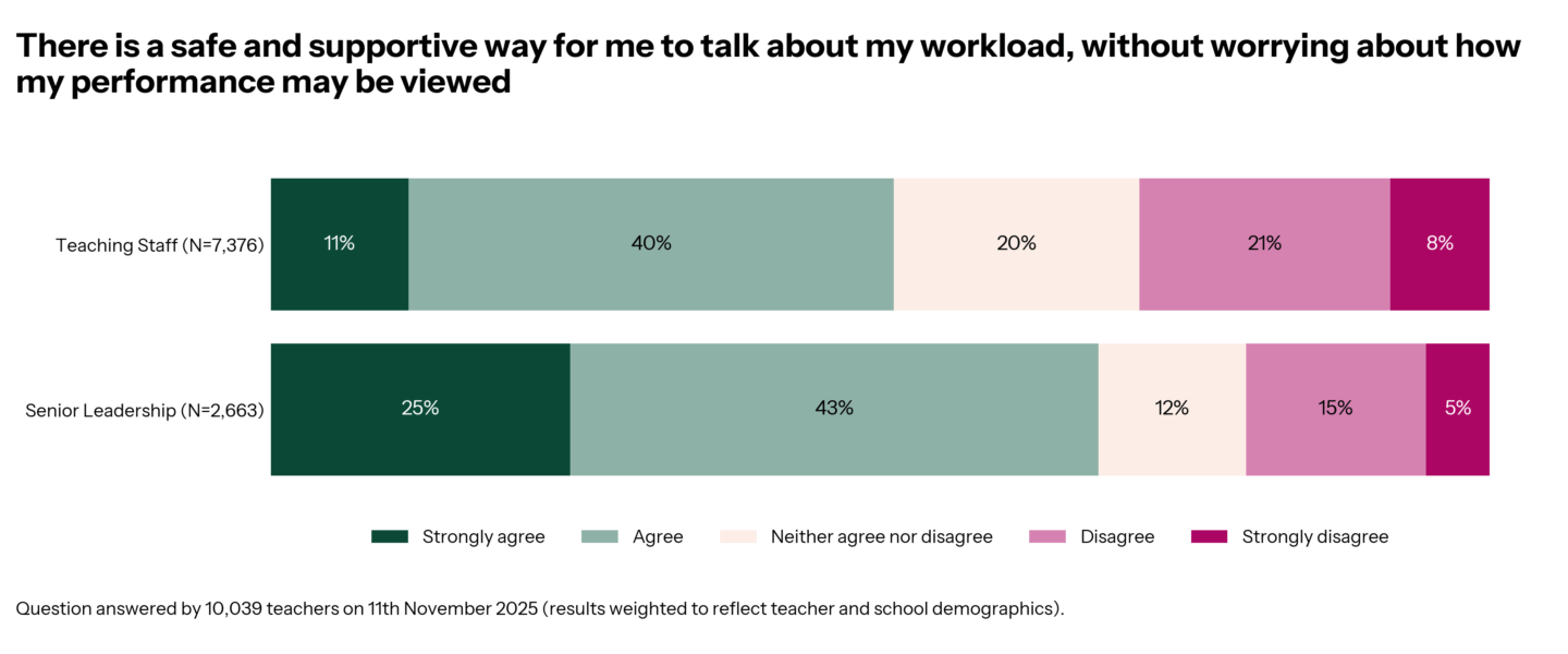 The important thing is, if workload is a problem, the teacher has a way of talking about it without worrying that there will be a negative fallout from raising the issue. But is that true for everyone? Teachers are less likely than leaders to feel they can talk about workload without worrying about negative consequences (51% vs 68% agree). Perhaps this is something that could be tweaked within the performance management process, and leaders can try and create a culture where speaking up when the workload is too high is met with practical help and support.