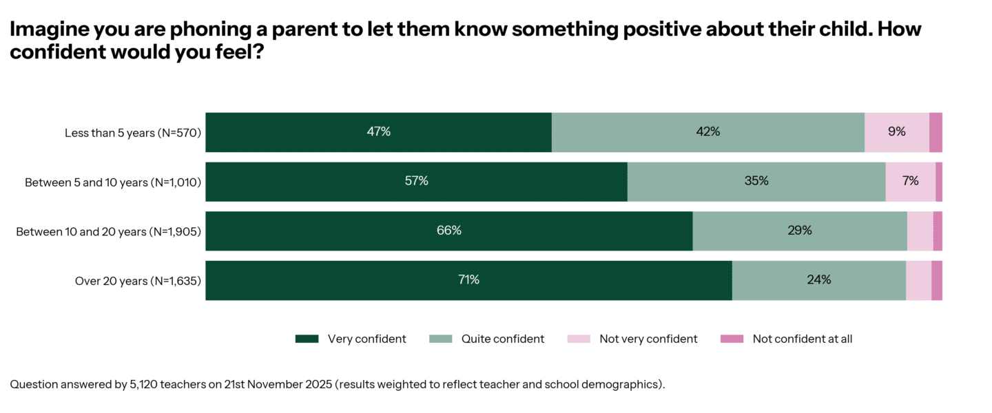 But how do feelings change if the purpose of the call is positive? Yes, confidence was higher – but there was still a significant number feeling unconfident about the phone call, and once again, newer teachers are more likely to report a lack of confidence: 11% of teachers in with less than 5 years experience, 8% of teachers with 5-10 years experience, 5% of teachers with 10-20 years experience, 4% of teachers in with over 20 years experience.