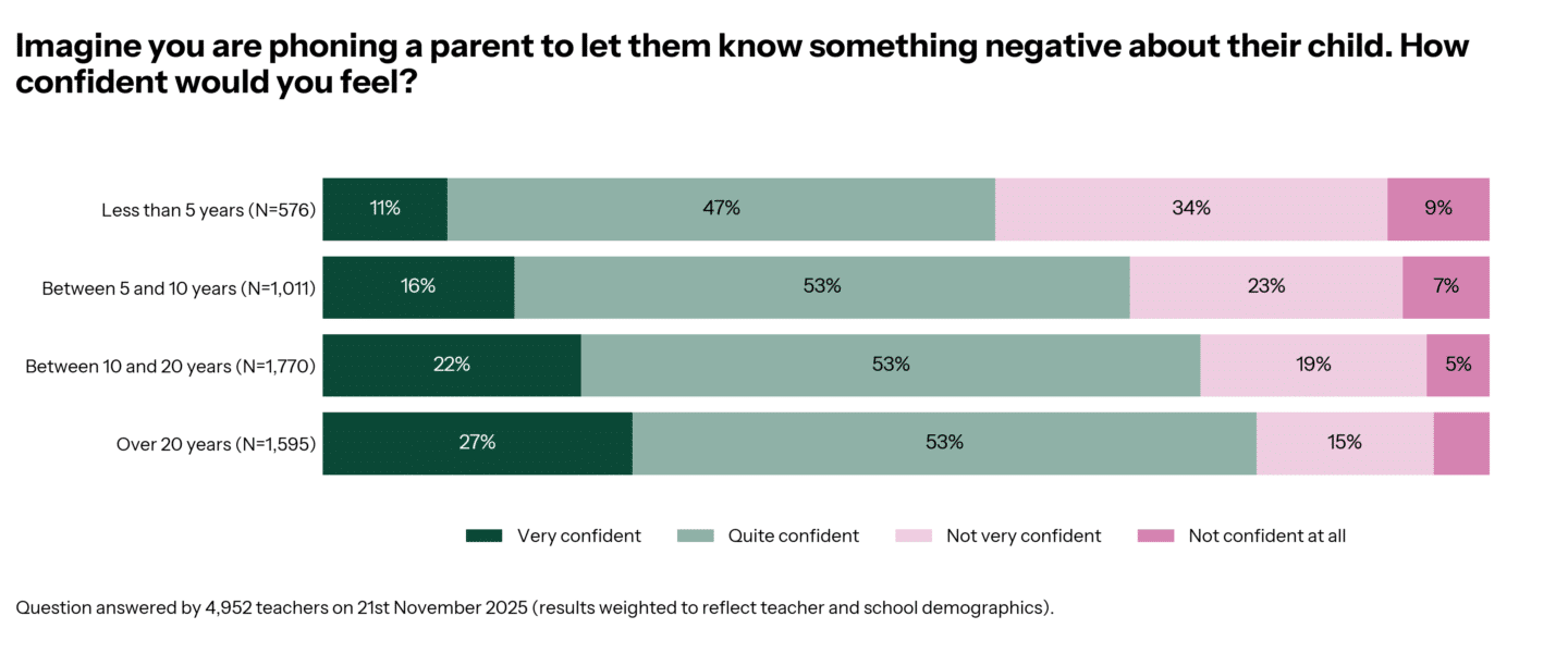 Ringing with bad news was unsurprisingly the less appealing option, but when we analysed the responses by years of experience teaching, we discovered less experienced teachers were more than TWICE as likely to feel unconfident about making a call compared to their more experienced colleagues: 43% of teachers with less than 5 years experience say they wouldn’t feel confident calling home vs 20% of teachers with over 20 years experience.