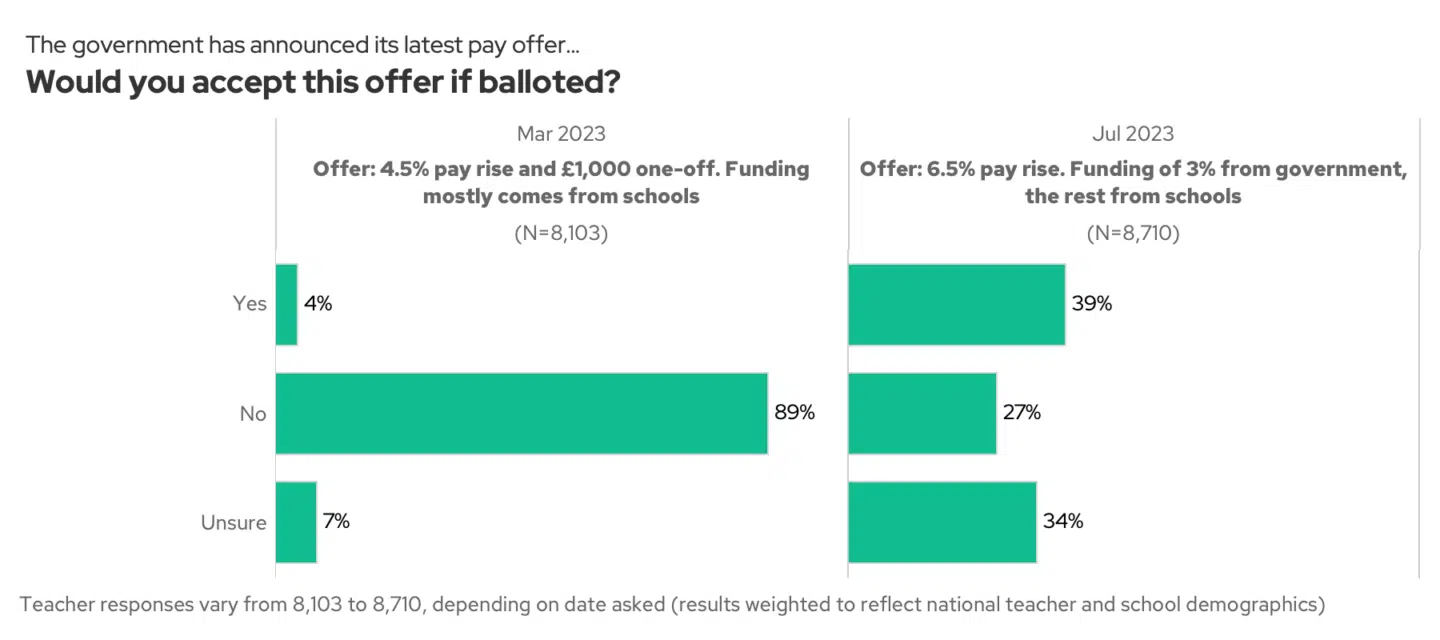 In March, teachers rejected a 4.5% pay rise and a £1,000 one-off payment. After several more days of NEU strikes, and successful strike ballots from NASUWT, NAHT and ASCL, the government had another search around the back of the sofa and offered a 6.5% pay rise with some more funding to partially cover the difference. So what did you make of it?