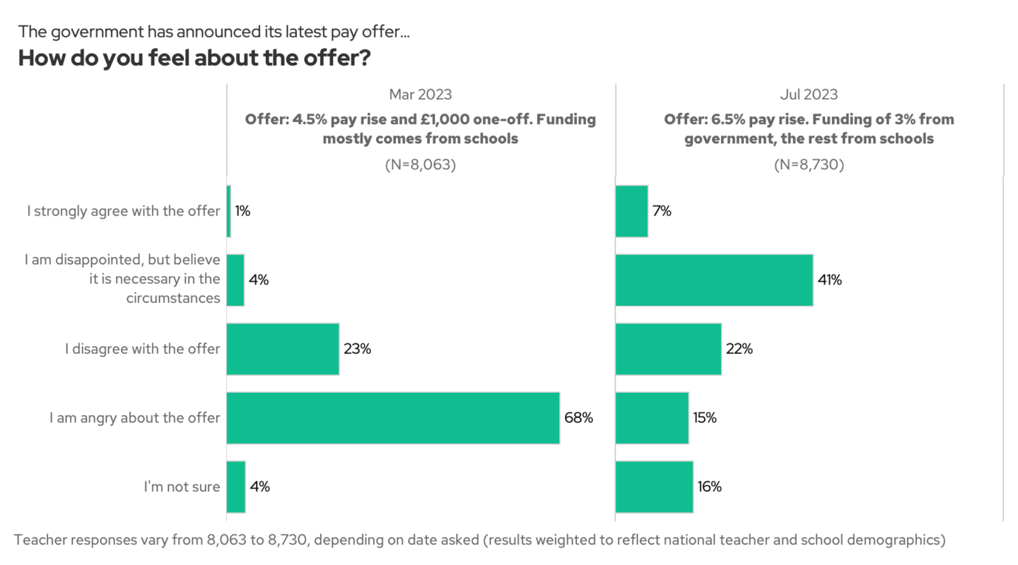 You’re happier than last time (which wouldn’t have been difficult) but far from overwhelmed. In March, 89% of teachers told us they would reject the offer. That’s now slipped to just 27%, with 39% in favour and 34% not yet sure.