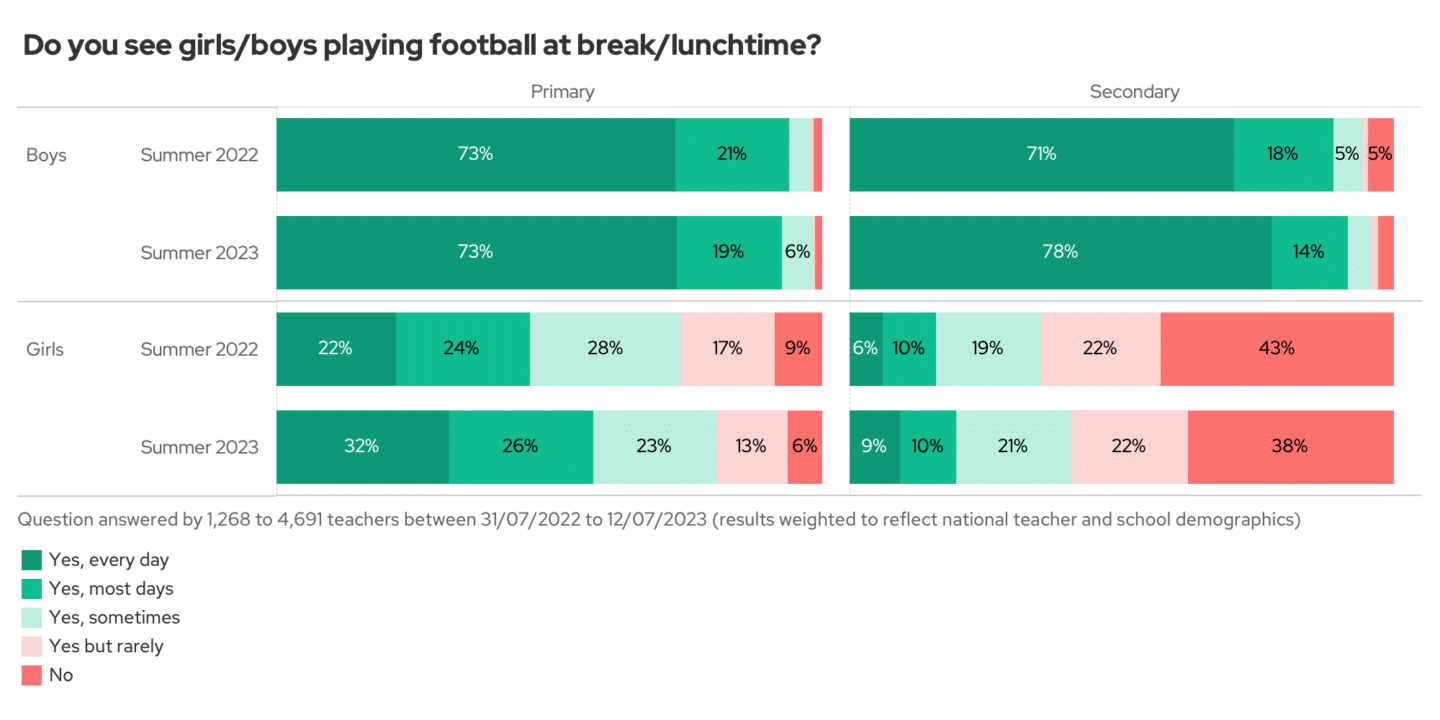 Schools are more likely to have a girls (or mixed) football team. In primary schools, 61% of schools had a girls (or mixed) team last year – this year, it’s 71%. In secondary, it’s up from 72% to 78%. (We should note though, that lots of teachers, particularly in secondary schools, said they weren’t sure.)
