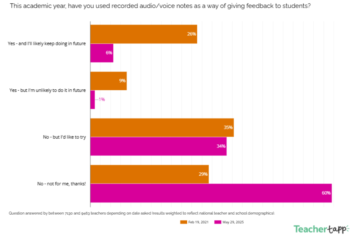 Fast forward to 2025… and it hasn’t quite panned out 😟. This year, just 6% of teachers say they’re still using voice notes for feedback. And a whopping 60% say they don’t use them – and never want to.