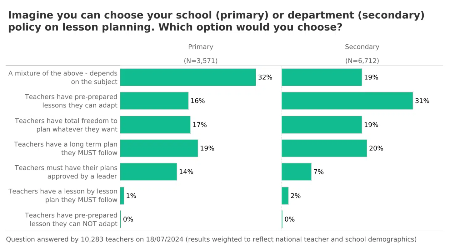 The most popular option for secondary teachers was pre-planned adaptable lessons (31%), followed by fixed long term plans (20%).
