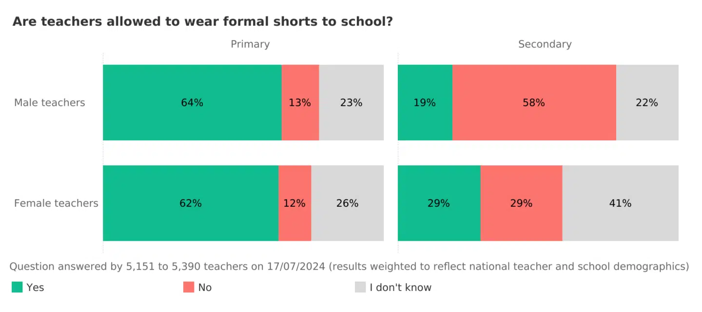 Similarly in secondaries shorts have moved from fringe to mainstream(ish). Previously only 5% said male teachers were allowed to wear shorts in their secondary school – meaning the 2024 result is an increase of 14 percentage points.