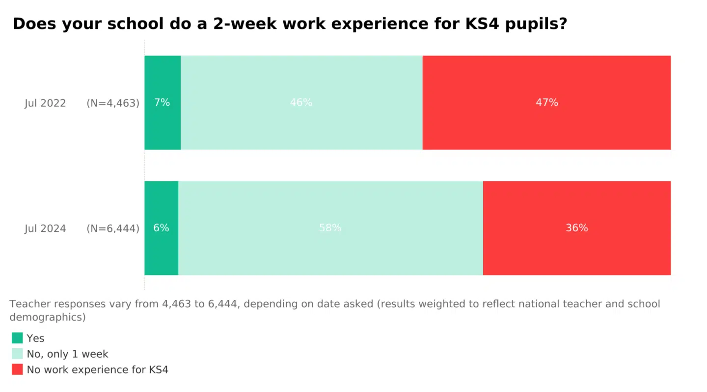 However, there is clearly a growing appetite in schools for work experience, as the number offering one-week placements has grown since 2022 (58% from 46%.)