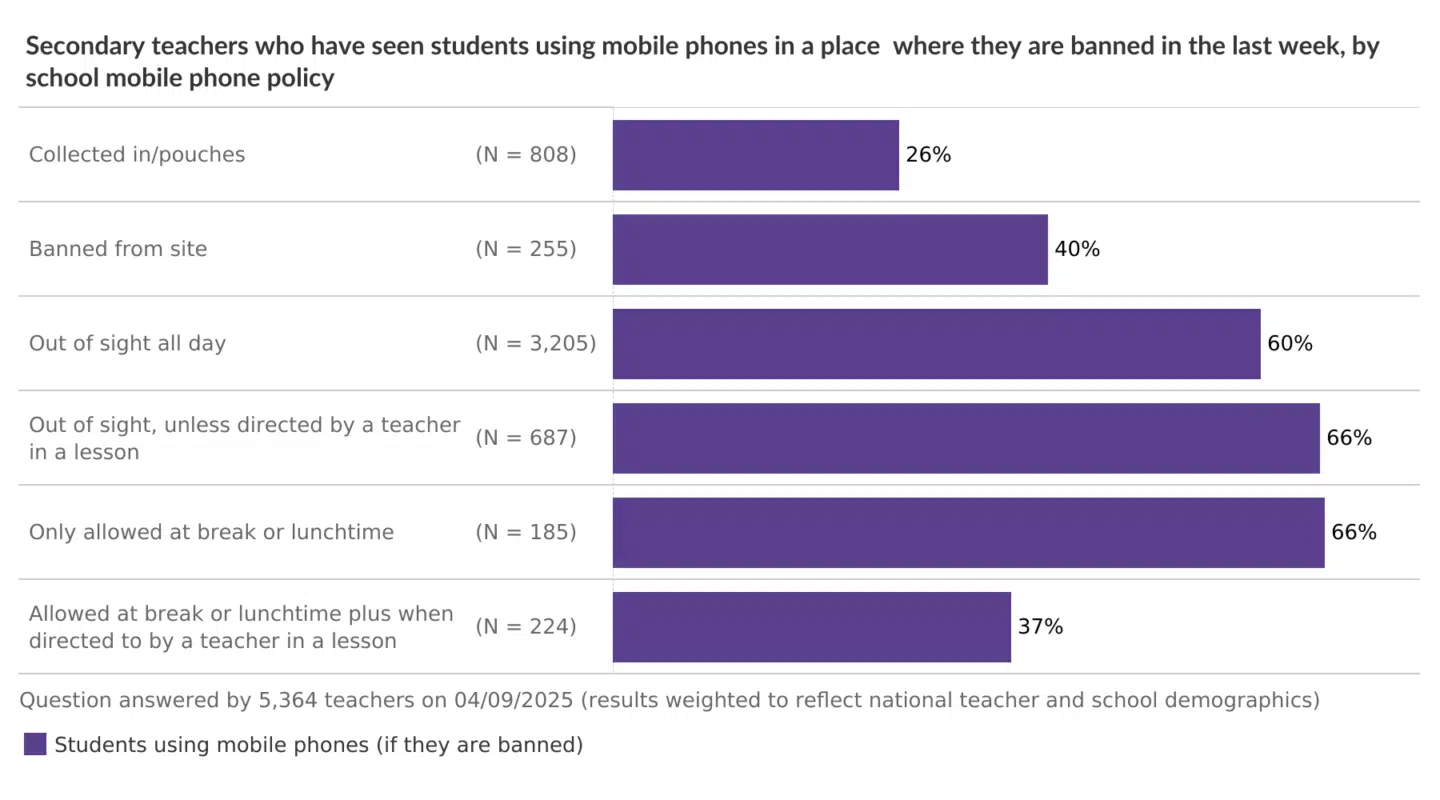 More than a quarter (26%) of teachers in secondary schools where phones are collected in or put in pouches still said those dreaded words in the last week – but teachers in schools where phones are meant to be off-site altogether also spotted students on their mobiles (40%).