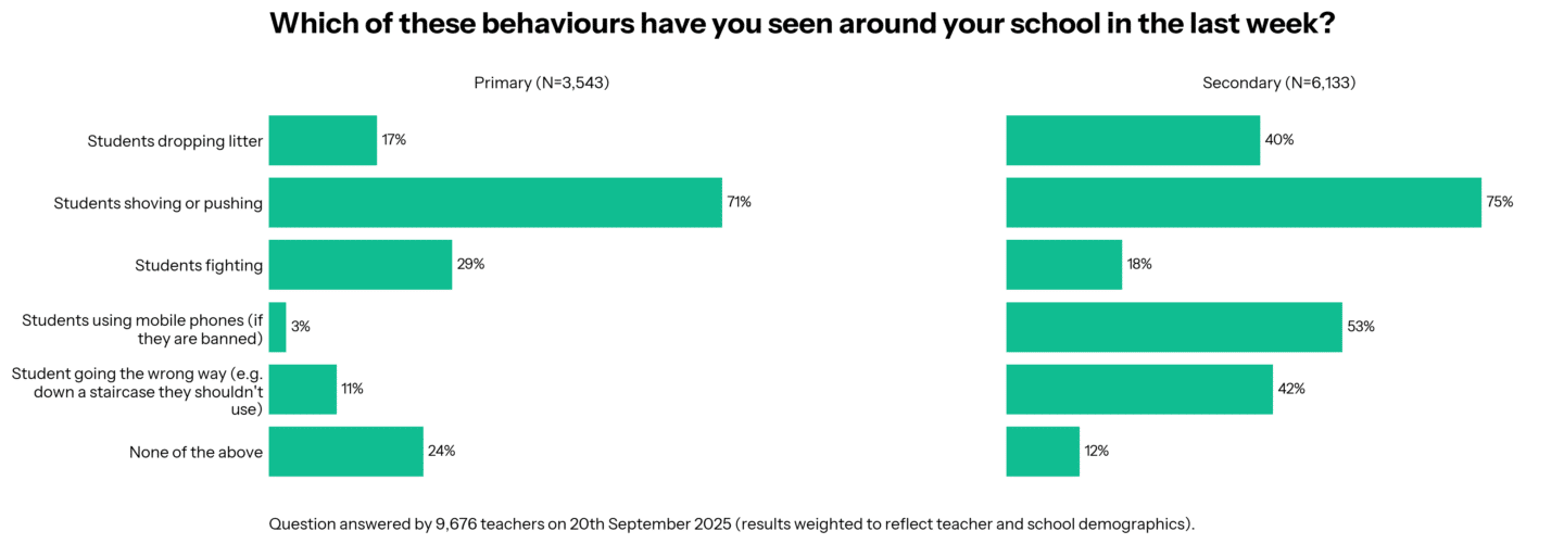 And it’s not just mobile phones causing issues – shoving and pushing (71% primary and 75% secondary), as well as dropping litter (17% primary and 40% secondary), have been problems for teachers.