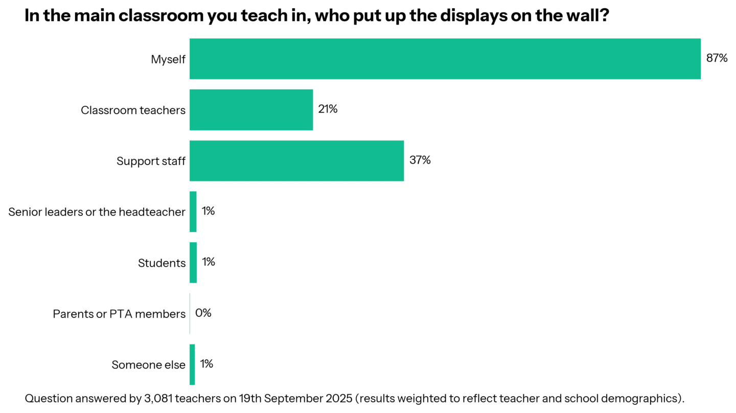 Who puts up the displays? Usually, it’s the teacher who mainly teaches in there (87%), and then support staff (37%) and other classroom teachers (21%).