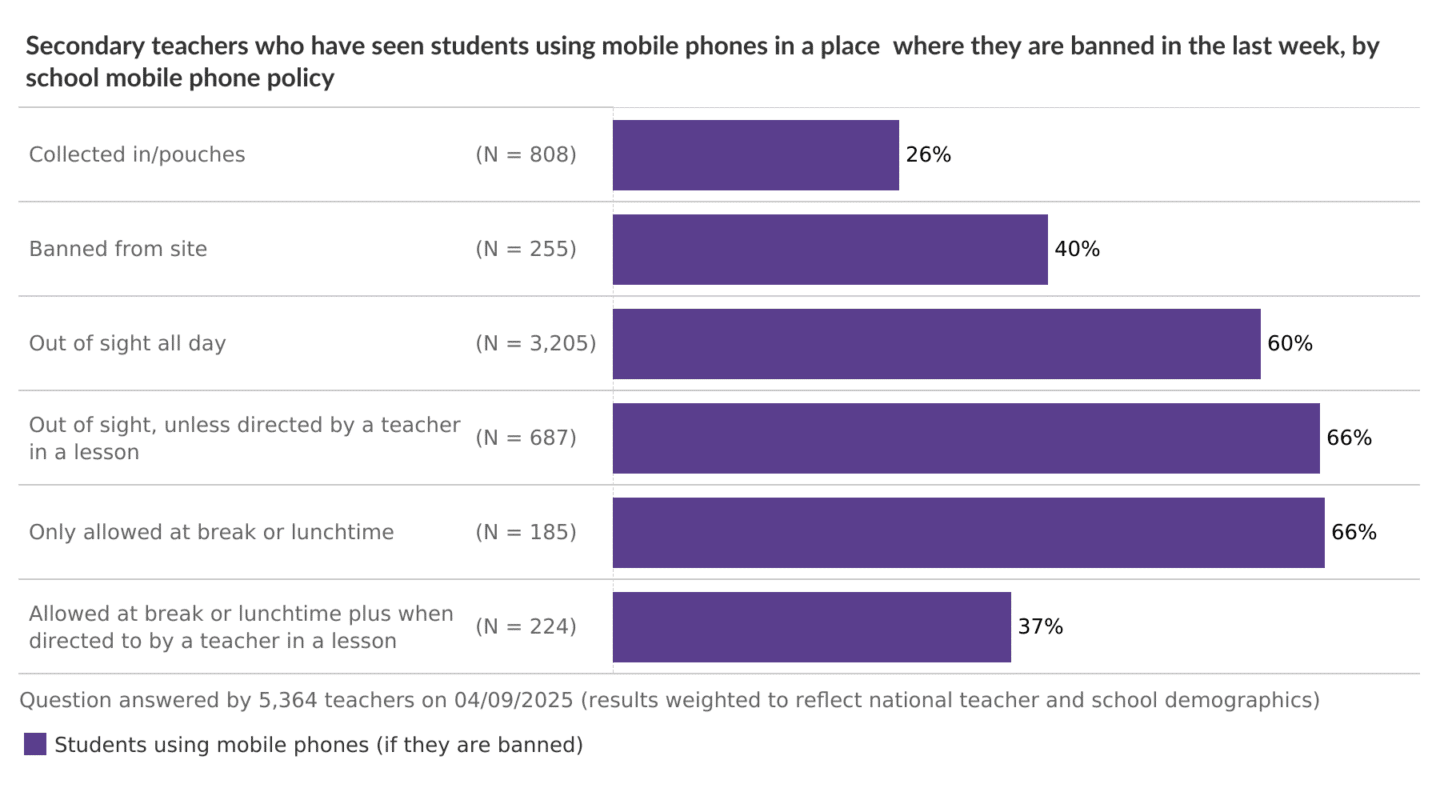 More than a quarter (26%) of teachers in secondary schools where phones are collected in or put in pouches still said those dreaded words in the last week – but teachers in schools where phones are meant to be off-site altogether also spotted students on their mobiles (40%).