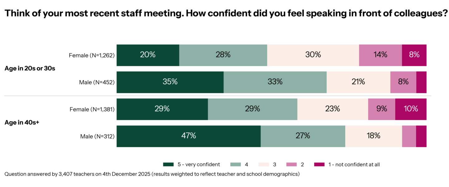 Similarly, at the other end of the scale, there is a male/female gap: 8% of women in their 20s and 30s report they feel “not confident at all” speaking up in meetings, compared to 3% of men in the same age group. This gap only increases with age, and when classroom teachers are over 40 women are more than THREE times as likely to say they have “no confidence” speaking in meetings (10% vs 3%).