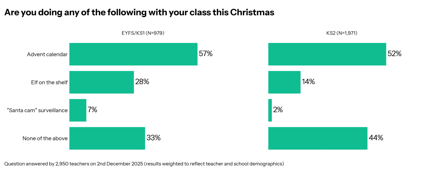 If you’re confused, then perhaps take a peek in one of the EYFS/KS1 classrooms to see if the teacher is doing ‘Elf on the Shelf’ – you have a decent chance of finding it there, with 28% of teachers telling us they were doing it.