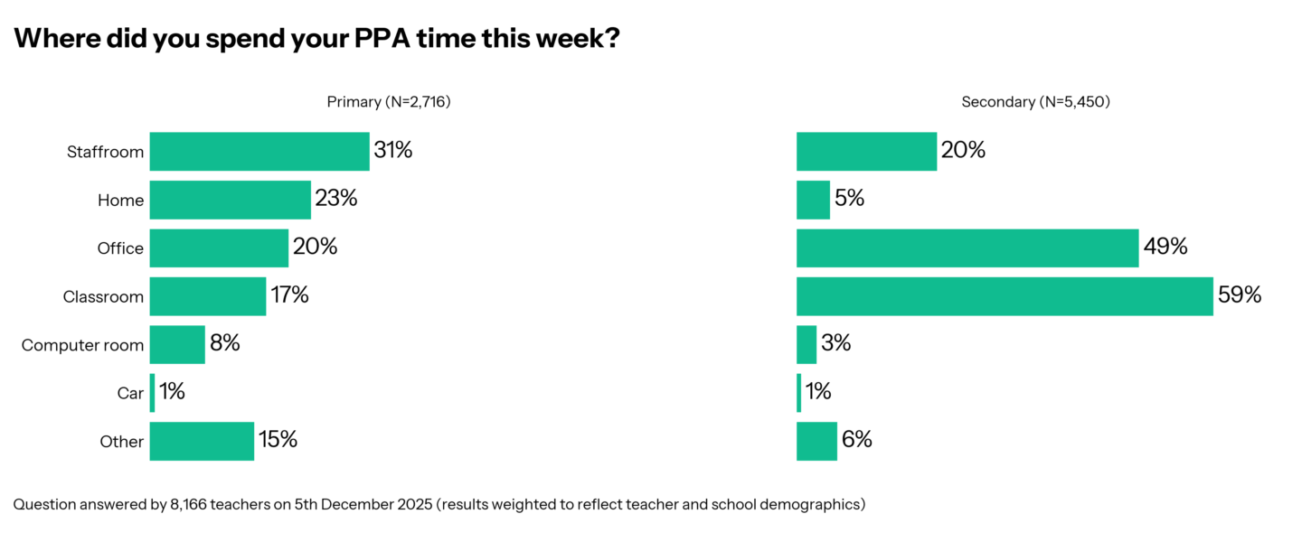 In primary schools, the staffroom is the most common place for teachers to do their PPA (31%) whereas in secondary, doing it in a classroom is the most common location (59%). Working from home happened for 23% of primary teachers and 5% of secondary teachers – and this was very similar to previous years.