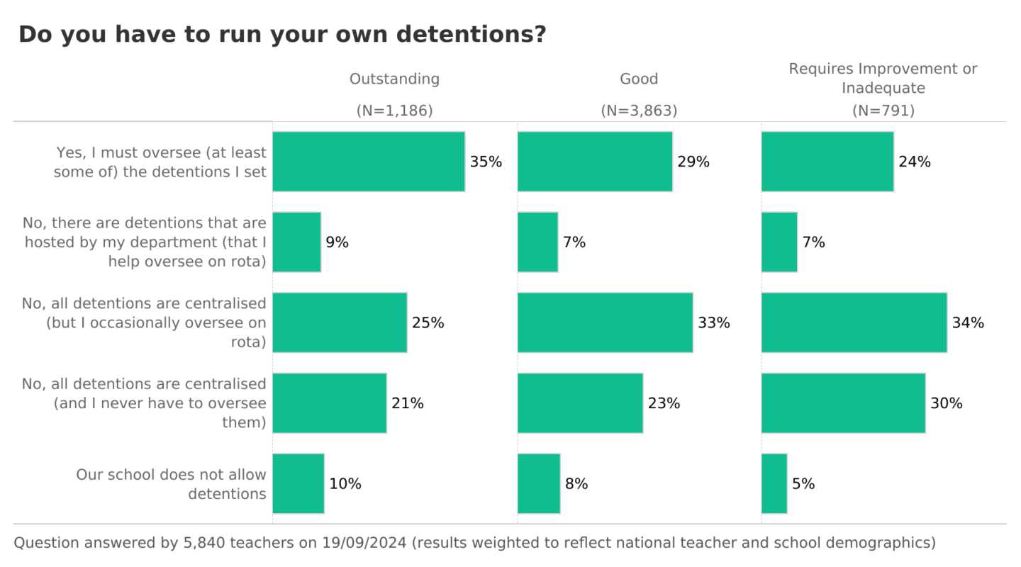 71% of teachers in Requires Improvement or Inadequate schools don’t oversee their detentions, compared to 55% of teachers in Outstanding schools.