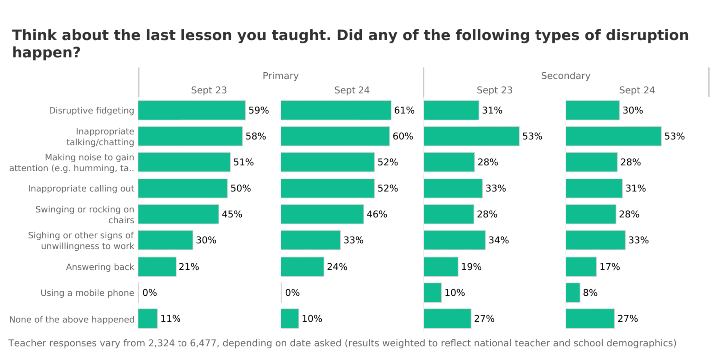 Between the phases, that low-level disruption looks very different. In primary classrooms, disruptive fidgeting was the number one disruptive behaviour (61%), whereas in secondary classrooms, inappropriate talking or chatting happened the most frequently (53%).