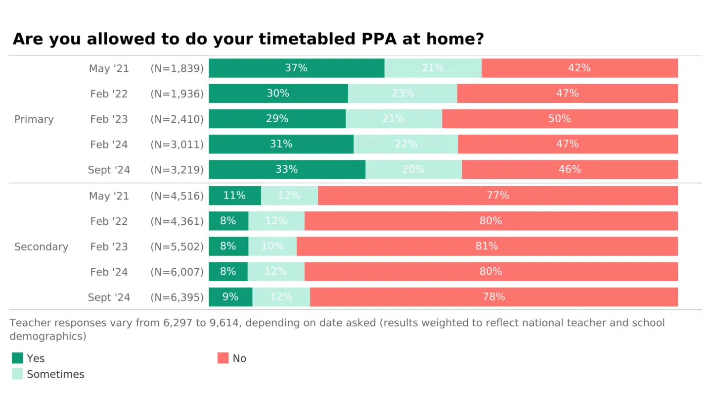 33% of primary teachers are allowed to do their PPA from home, up 2 percentage points from when we asked last academic year.