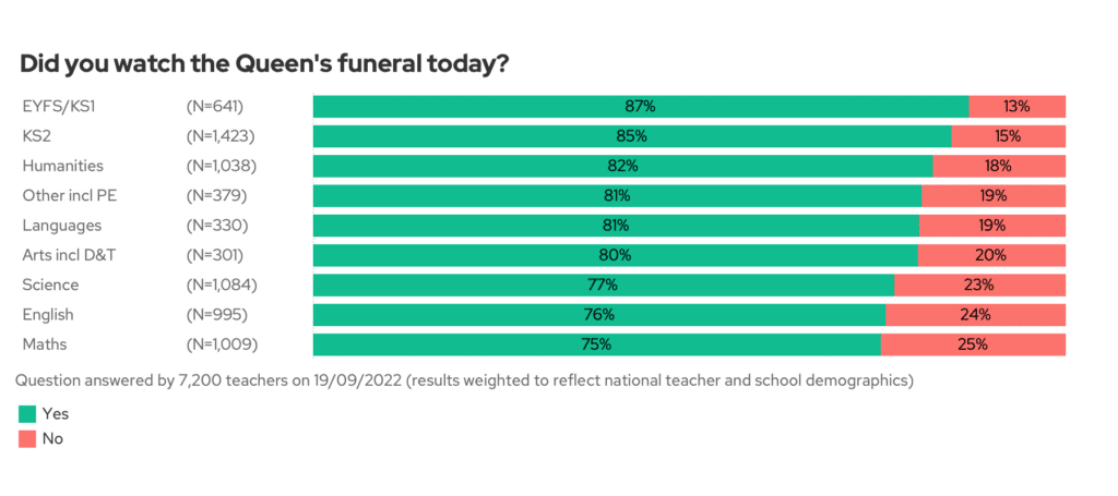 Which teachers were most likely to be watching the Queen’s funeral? We thought it might be the oldest teachers, but we were wrong! Women were more likely to be watching it (82% versus 74% of men). Those teaching with the youngest children were most likely to watch the funeral. And within secondary, humanities teachers watched in the greatest numbers, perhaps seeing it as an opportunity to dose up on some history!