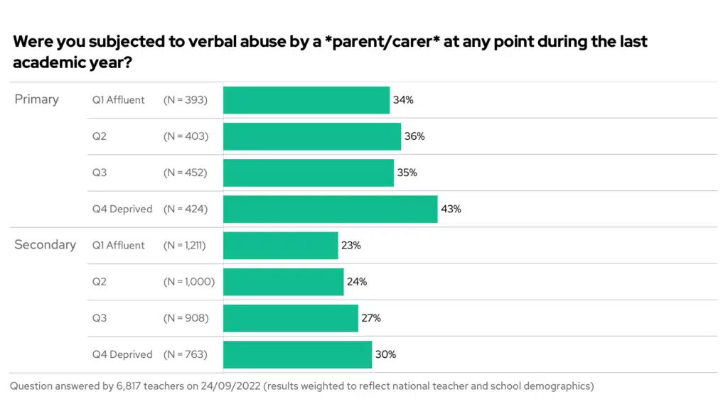 Some of you are at greater risk of parental abuse than others. A massive 73% of headteachers experienced verbal abuse in the last year. Primary teachers have much greater contact with parents at the school gate, which explains why they are also more likely to be subject to abuse. And unfortunately those serving the most deprived communities encounter more abuse both face-to-face and on social media.