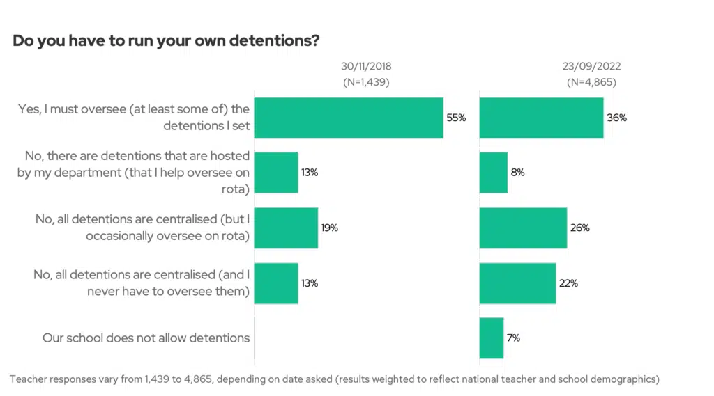 There is also significant variation in how detentions are organised by communities served. Those in fee-paying and in the most disadvantaged schools are most likely to have centralised detention arrangements, but perhaps for very different reasons? For those in disadvantaged schools who give out detentions several times a week, being asked to run your own would amount to a frequent Lesson 6. But in fee-paying schools where detentions are less common, perhaps centralised detentions allow teachers to supervise after-school activities that often run to 6pm each day (let us know via the usual channels!)?