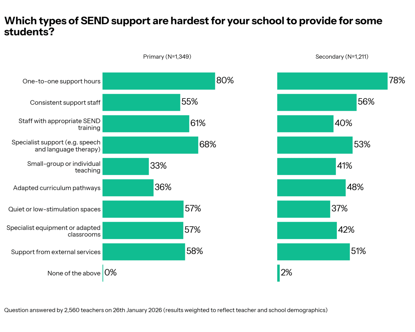 - 1️⃣ One-to-one support is the most common type of support for SENCOs to report they struggle to provide (80% primary vs 78% secondary).