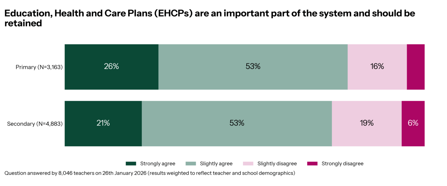 Despite the struggle to deliver what is included in the EHCPs, retaining them is important to the majority of teachers, with 79% of primary and 74% of secondary teachers agreeing they are important and shouldn’t be removed.