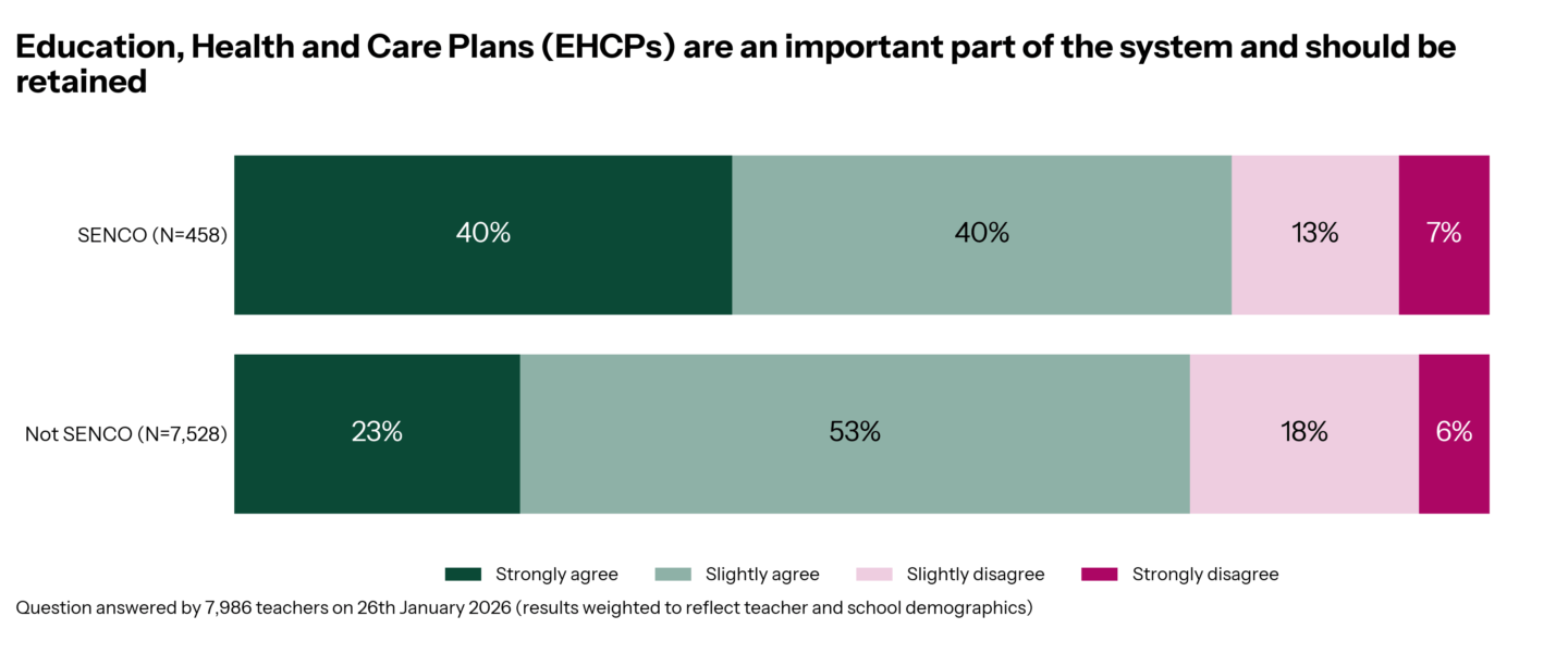 Among those working most closely with EHCPs, that strength of feeling increases, with 40% of SENCOs ‘strongly agreeing’ EHCPs should be retained, compared to 23% non-SENCOs.