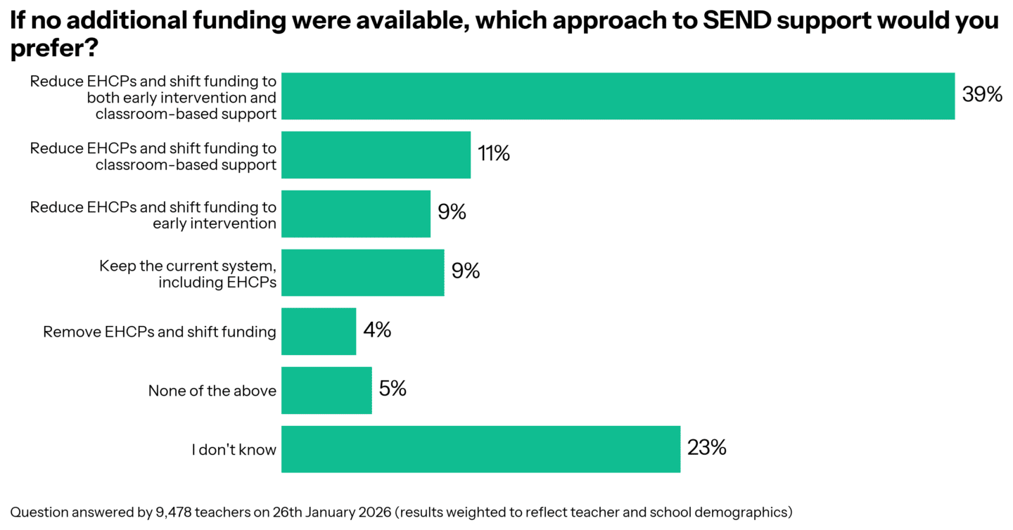 In the absence of more funding, the most popular reform is to reduce EHCPs and shift funding to both early intervention and classroom-based support (39%).